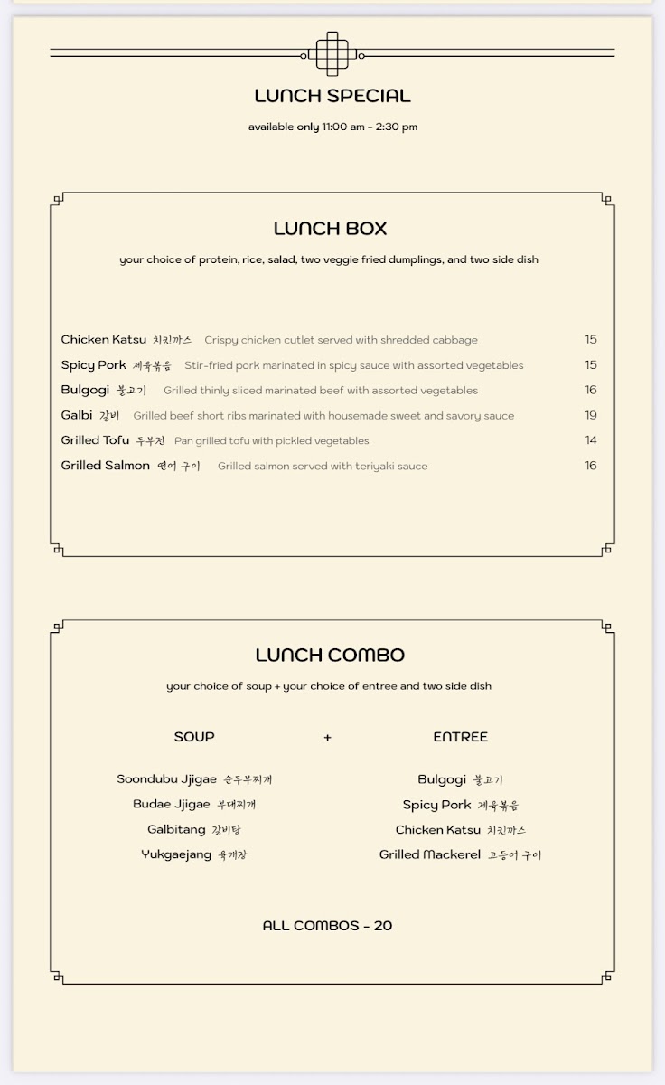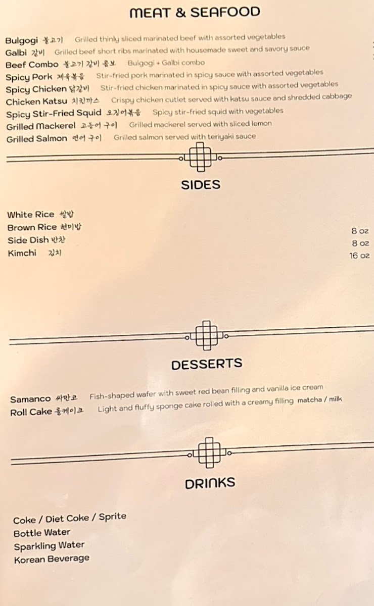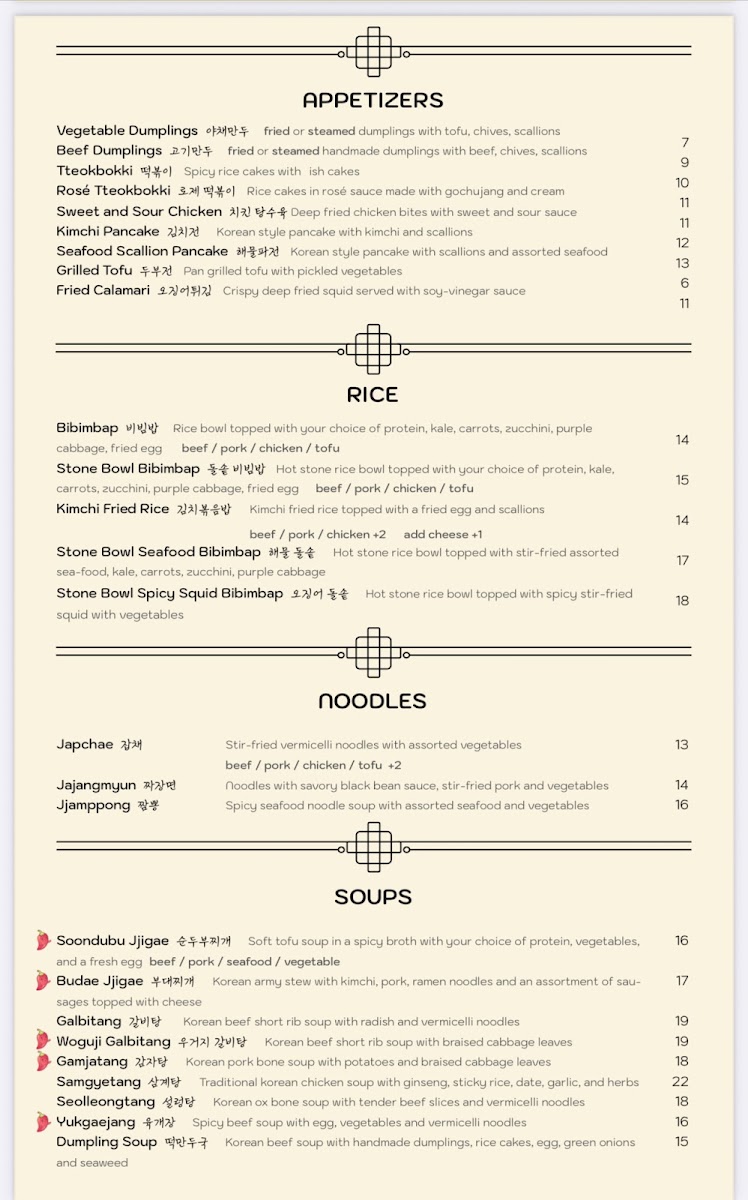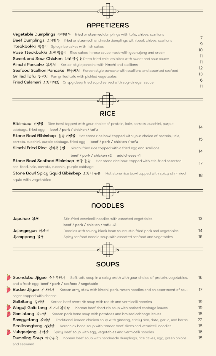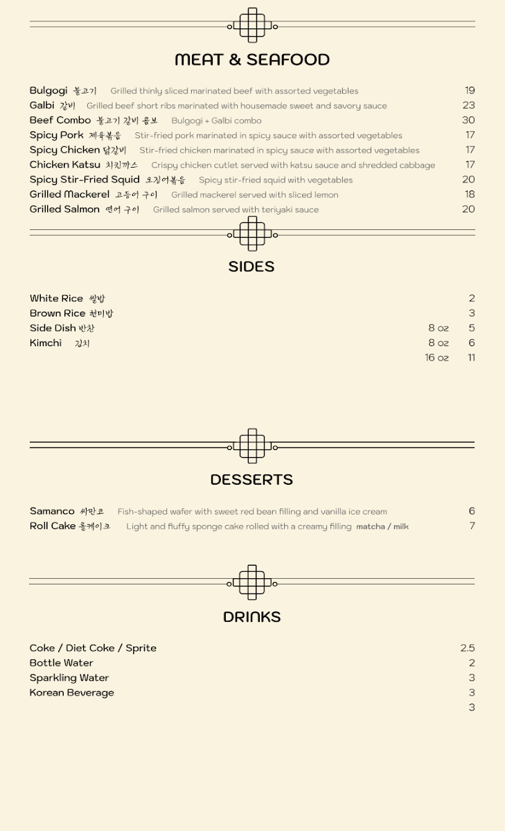 *Soup * Maet(entree) Soondubu jjigae Bulgogi Budae jjigae Spicypork Galbitang Chicken katsu Yukgaejang Grilled mackerel