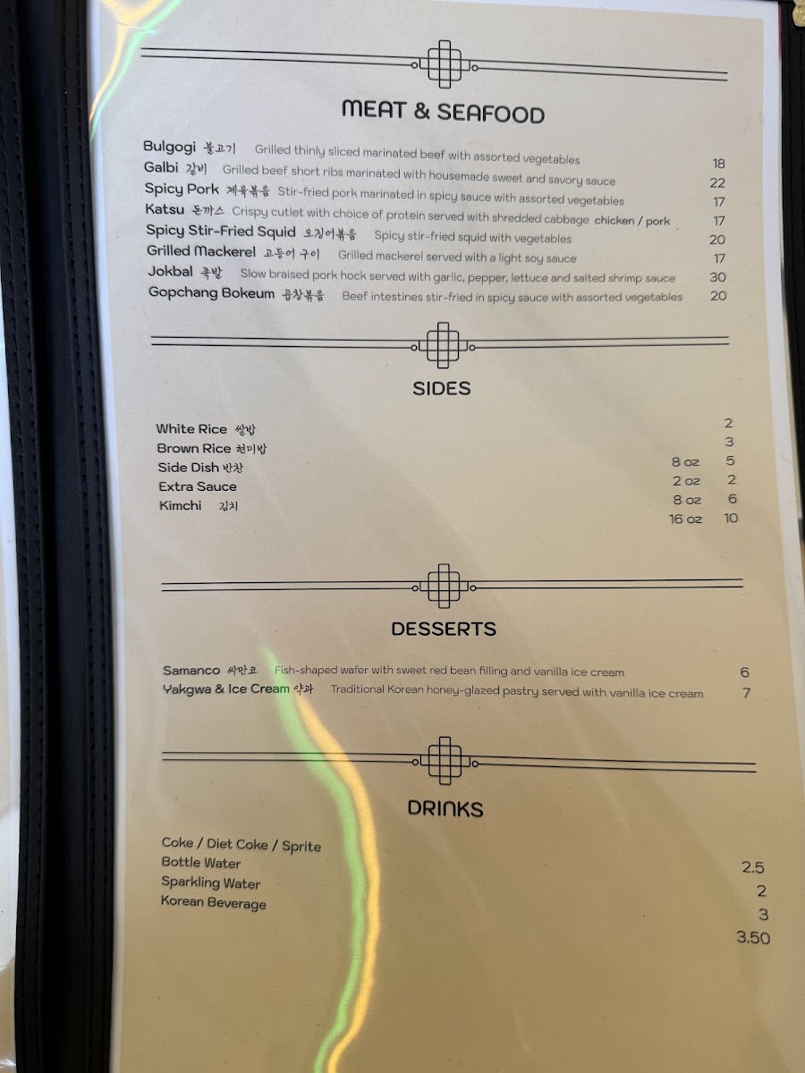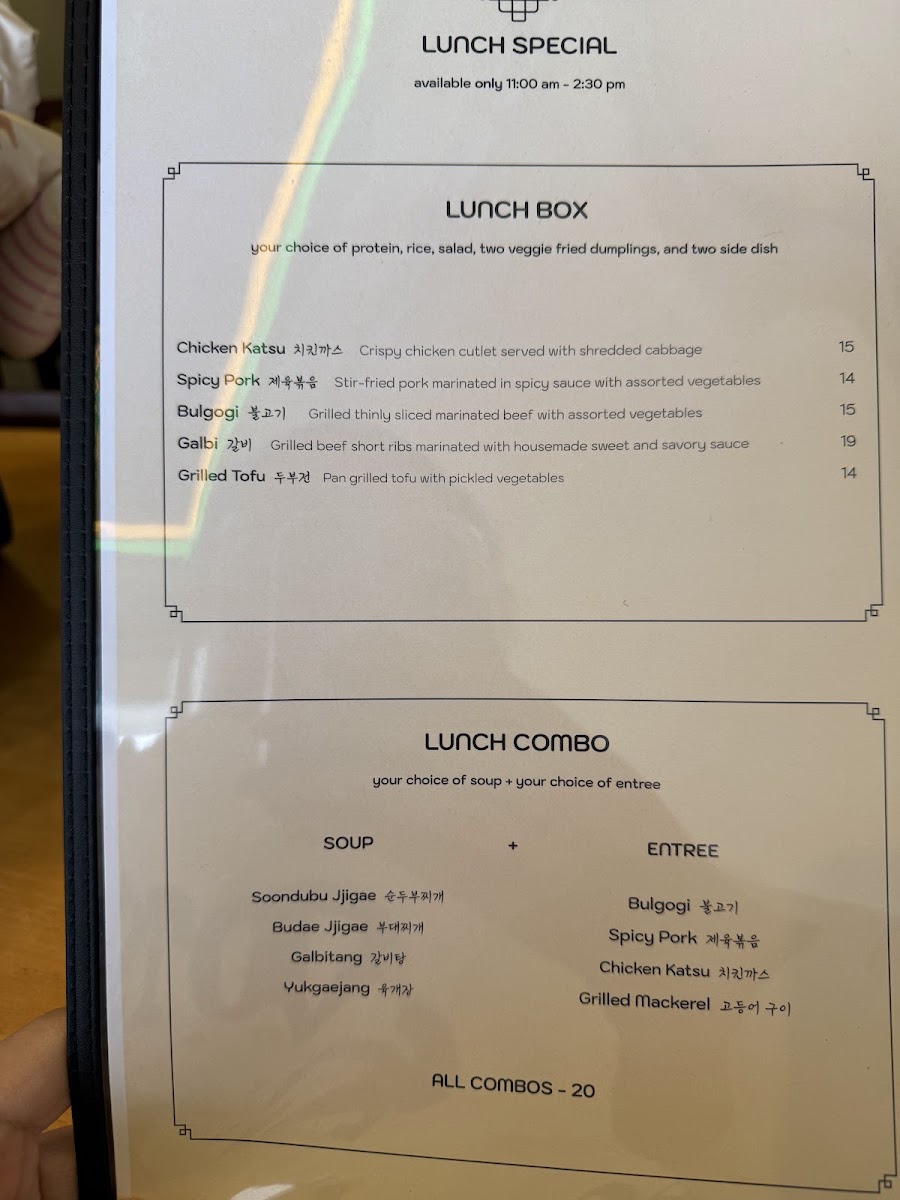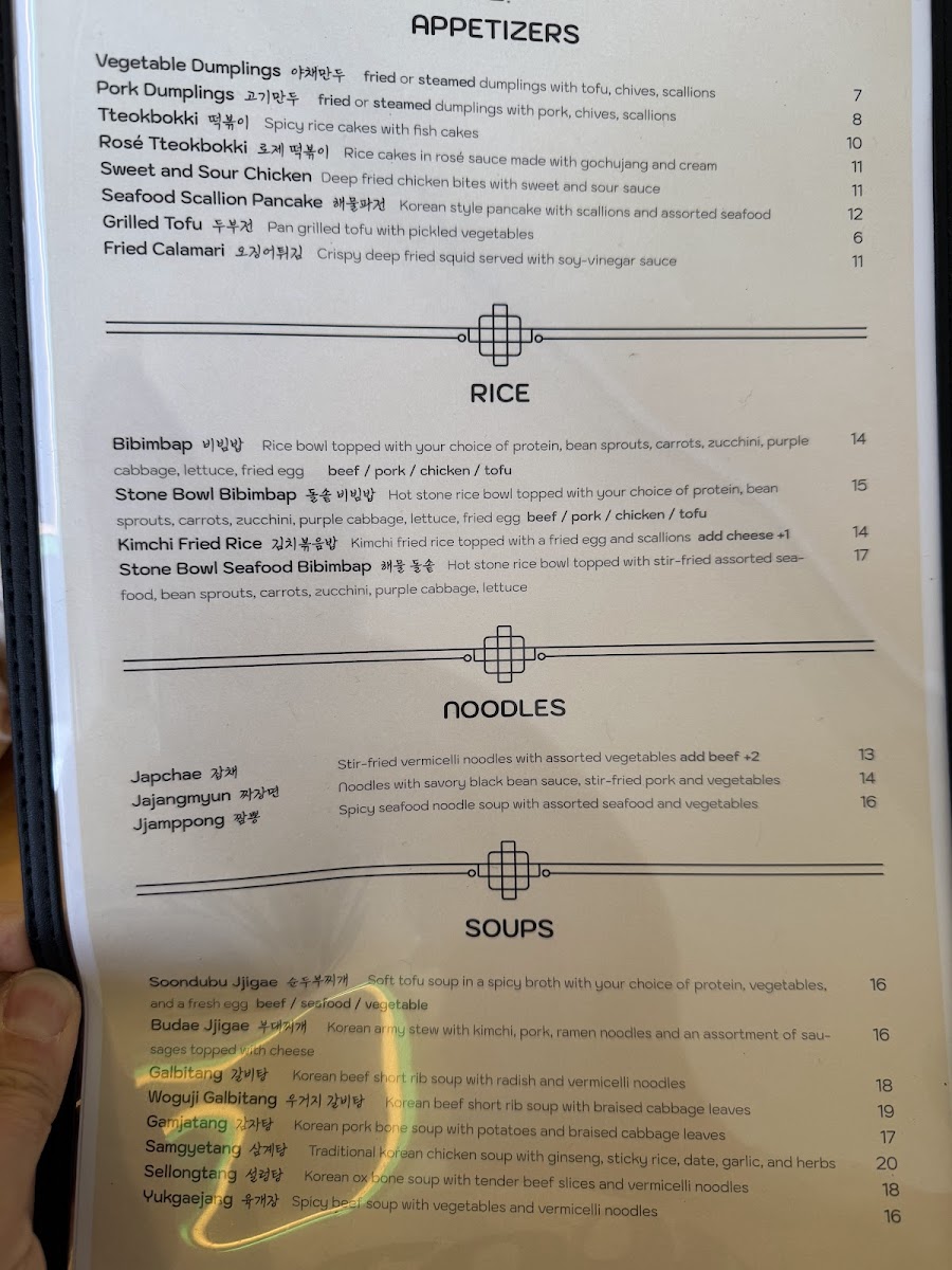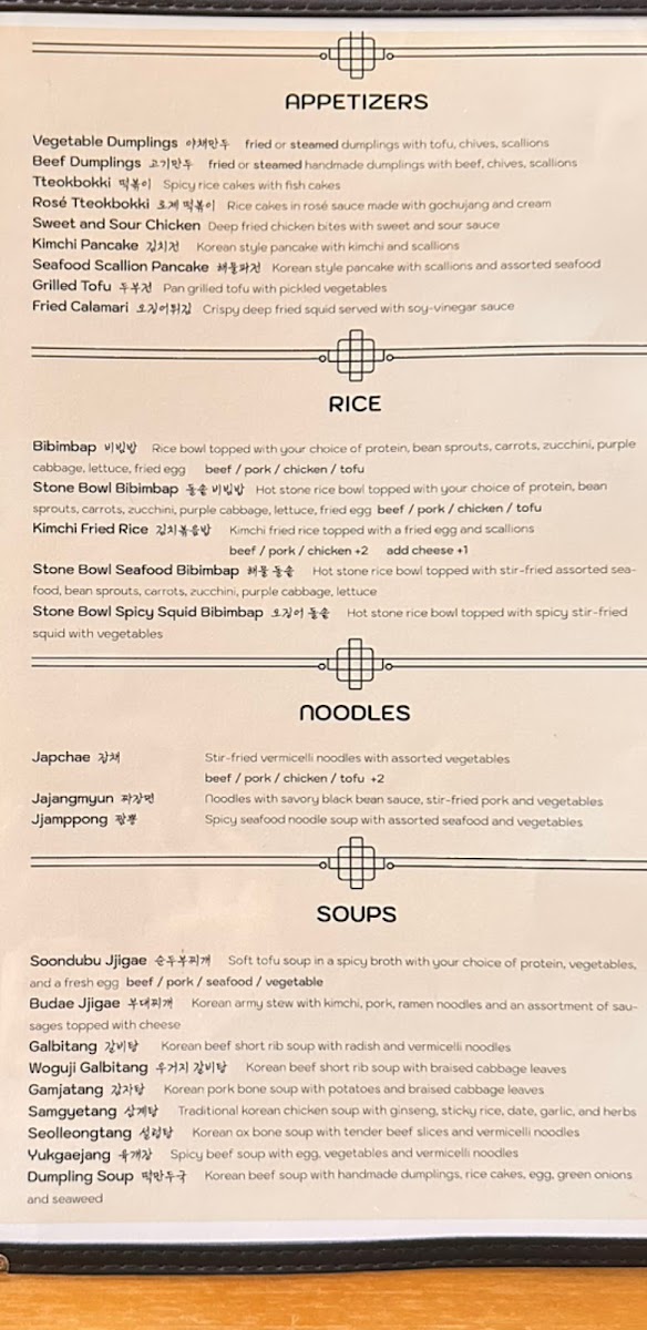 *Soup * Maet(entree) Soondubu jjigae Bulgogi Budae jjigae Spicypork Galbitang Chicken katsu Yukgaejang Grilled mackerel